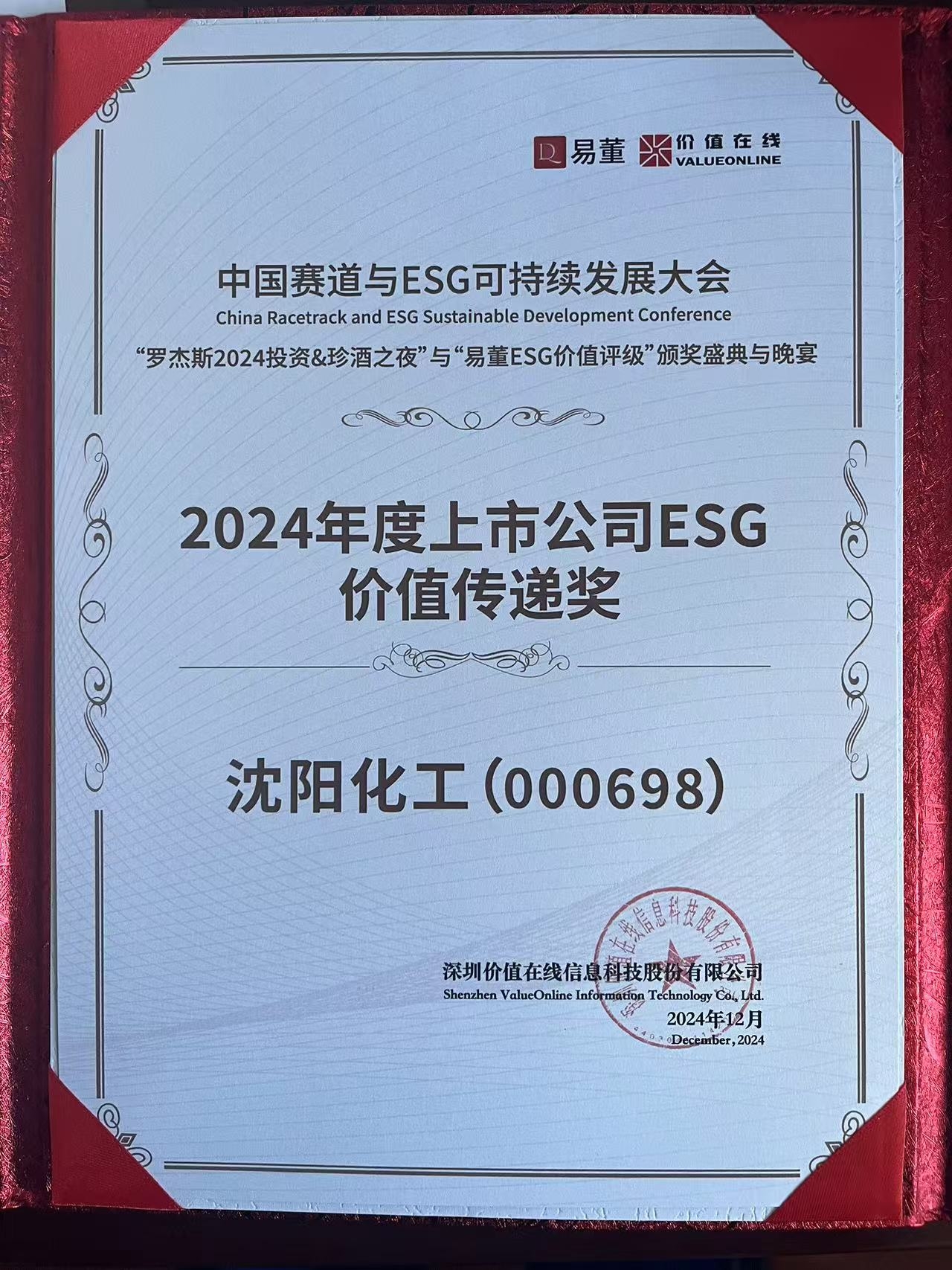 12月7日—8日,由價值在線和亞洲商務大學堂主辦,以“投資光明,共創(chuàng)未來”為主題的“中國賽道與ESG可持續(xù)發(fā)展大會”在深圳市光明區(qū)召開。數(shù)百家上市企業(yè)代表云集,聚焦綠色創(chuàng)新,共同探索經濟高質量發(fā)展路徑。大會發(fā)布2024年度易董ESG+8“價值100榜單”,沈陽化工股份有限公司(以下簡稱“沈陽化工”)憑借其在環(huán)境、社會及公司治理(ESG)領域的卓越表現(xiàn),成功榮獲這一殊榮。此前,沈陽化工已獲得“國新杯·ESG金牛獎”,此次獲獎為沈陽化工于本年度在ESG工作領域收獲的第二大獎項。